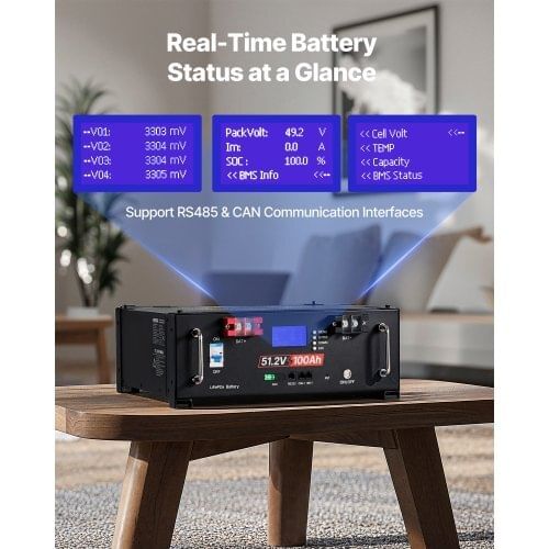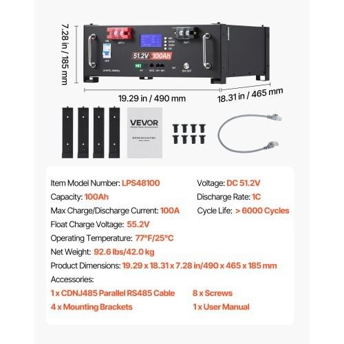 Cycle Life: > 6000 Cycles,Operating Temperature:77℉/25℃,Capacity: 100Ah,Voltage: DC 51.2V,Item Model Number:LPS48100,Float Charge Voltage: 55.2V,Discharge Rate: 1C,MaxCharge/Discharge Current: 100A